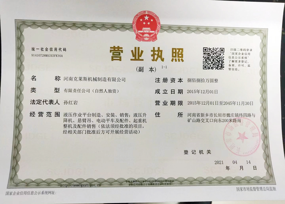 河南克萊斯機械制造有限公司位于河南省長垣市魏莊工業園區,公司注冊資金捌佰捌拾萬元整,在職員工40余名,擁有研發設計團隊,是一家生產液壓升降作業平臺及旋臂起重機生產銷售的廠家。  公司主要產品有:固定導軌式液壓升降作業平臺、移動式液壓升降平臺、車載式液壓升降平臺;定柱式懸臂吊、墻壁吊、電動平車、登車橋等?! 【嫉脑O備,嚴格的管理是公司得以不斷發展壯大、產品能夠贏得用戶依賴的根本所在?!  熬_、...... <了解更多>